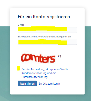 3. Geben Sie Ihre Daten ein, einschließlich E-Mail-Adresse, Name, selbst erstelltes Passwort und Captcha-Wort. Stellen Sie sicher, dass Sie das Kästchen "Bei der Anmeldung akzeptieren..." anklicken, bevor Sie auf "Registrieren" klicken.