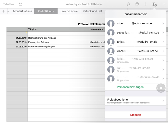 Das größte Problem war das Einladen der Schüler in das Dokument (siehe oben)